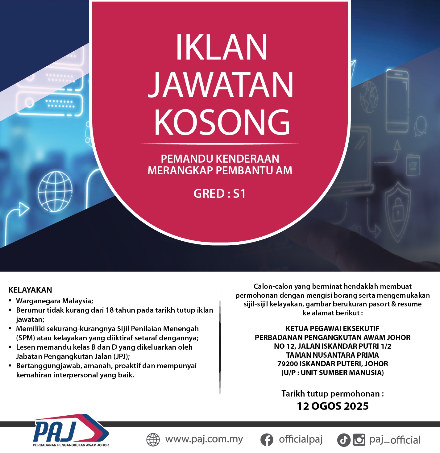 • Iklan Jawatan Kosong : Perbadanan Pengangkutan Awam Johor (PAJ)